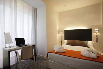 The guest rooms feature modern decoration, with bright colored, minimalist interiors. All guest rooms in the Hotel Petit Palace Canalejas include a free laptop computer with free internet access. Guest rooms also include individual climate control (air conditioning and heating), satellite LCD television, safe deposit box and mini-bar. All bathrooms are equipped with hydro-massage showers.